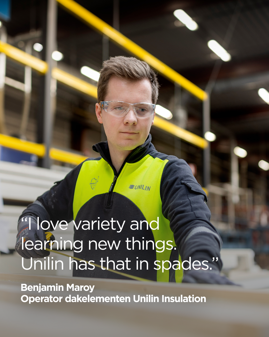 After two years, Benjamin felt that he missed production. “I like working on the line. It’s more hands-on and I really enjoy having control over the product.” Together with the HR manager in Avelgem, he looked for a role that was a better fit. “She contacted colleagues across different divisions and sites. After just one week, I was invited for an interview at Unilin Insulation in Desselgem.” For Benjamin, this was confirmation that employees really have a say and are well supported. 2026 began with a new challenge as a milling machine operator for roof elements at Unilin Insulation.