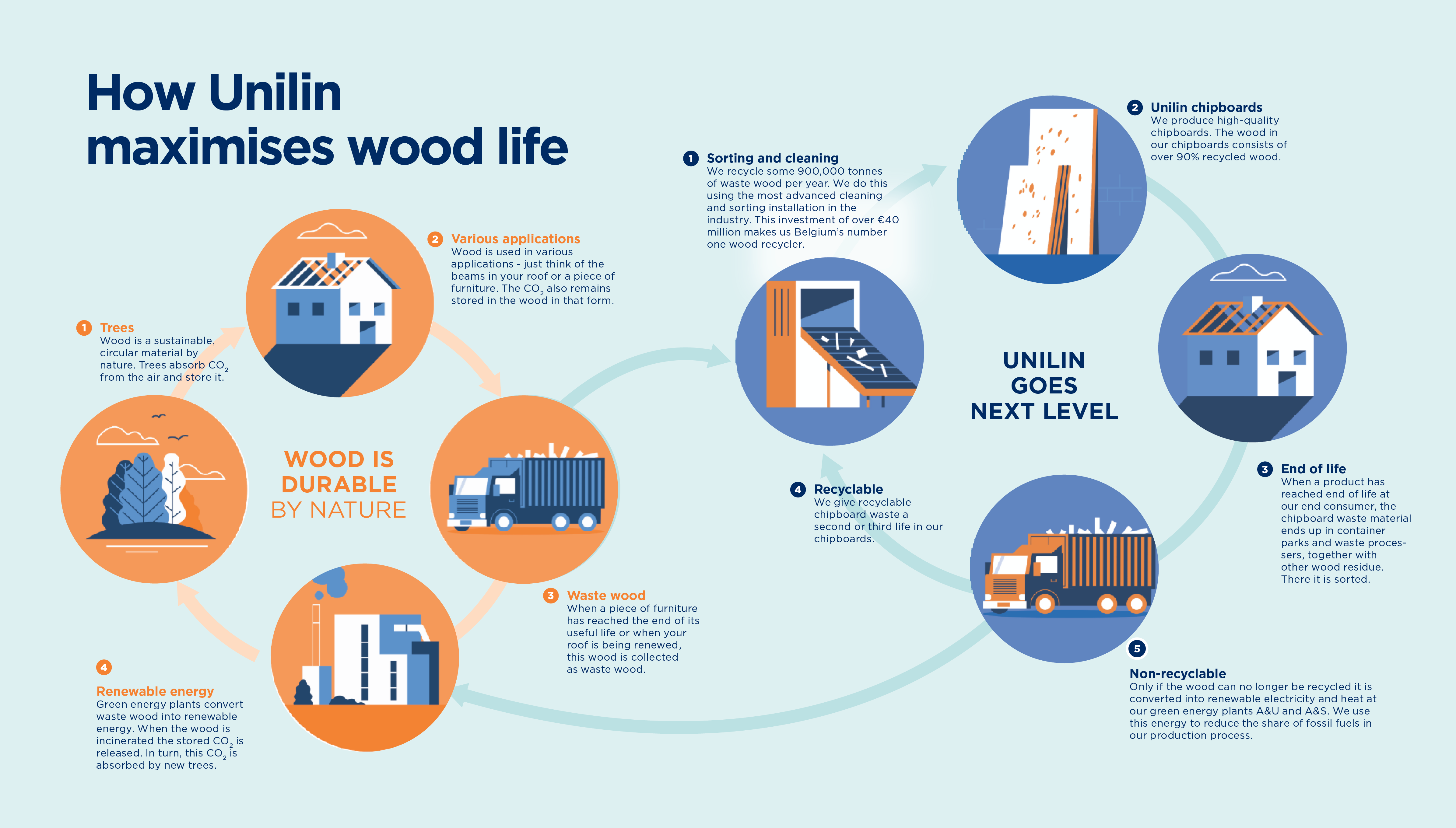 These initiatives fit seamlessly into Unilin’s One Home sustainability strategy, which aligns with the Paris Climate Agreement. Our goal is for at least 25% of the raw material mix to consist of recycled materials in the future. “If we achieve this target, our MDF, HDF and laminate production will be able to store around 380,000 tonnes of CO₂ per year in the wood fibres that are given new life,” says Coudenys.