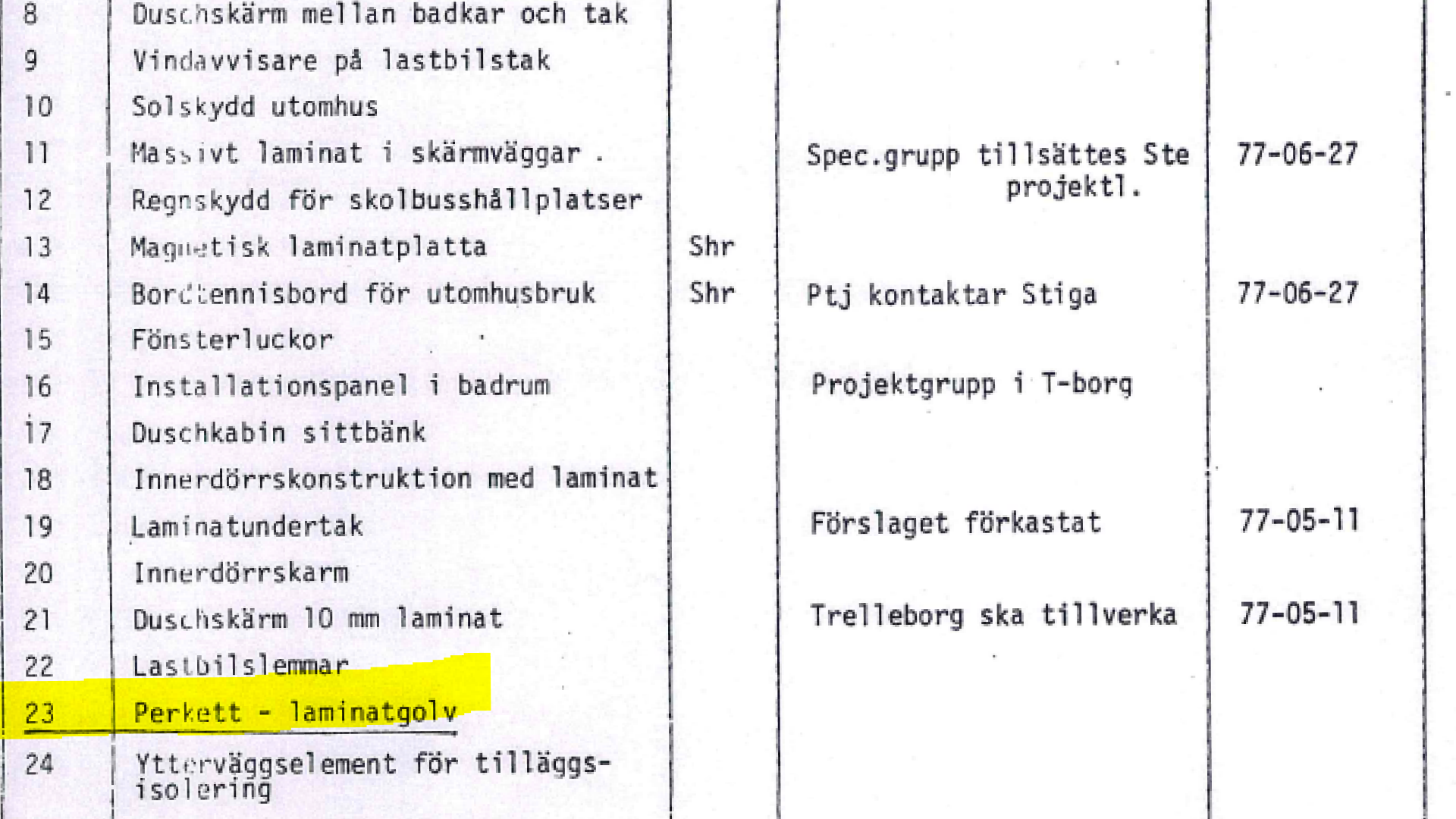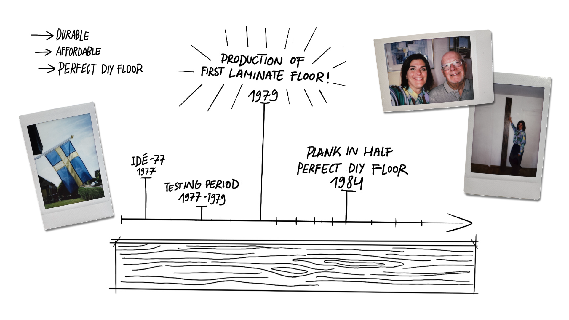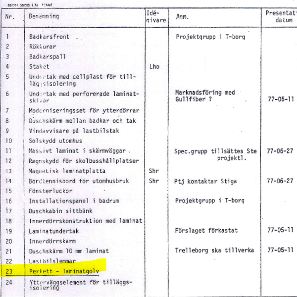 The team grabbed the bull by the horns. In 1977 they organised Idé 77, a multi-day brainstorming session. The goal was as simple as it was challenging: to come up with as many new applications for laminate panels as possible. Sven, then still a Product Developing Engineer, was also at the table. “No idea was too crazy,” he recalls. “After a few days, around 200 proposals had been tabled.” A shower bench, panels for ping pong tables and even a shelter for bus stops made the list, but in the end it was number 23 that made history: laminat golv, or the laminate floor.