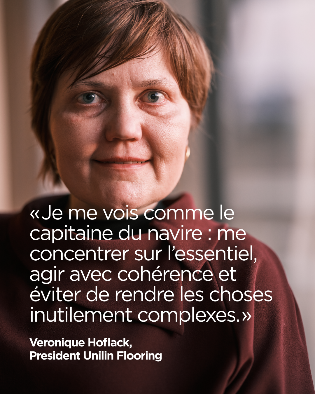 Veronique commence dans un contexte loin d’être évident. “Le secteur de la construction traverse une période difficile et Unilin Flooring est également mis au défi par l’évolution du comportement des clients, la pression sur les prix et la concurrence. Cela a déjà mené récemment à des changements stratégiques importants. Ma première priorité est de poursuivre ce qui a déjà été lancé, mais avec une vision cohérente et des choix clairs. C’est exactement ce qui me motive. Je me vois comme la capitaine du navire : me concentrer sur l’essentiel, donner la direction, créer la confiance et surtout bien écouter.”