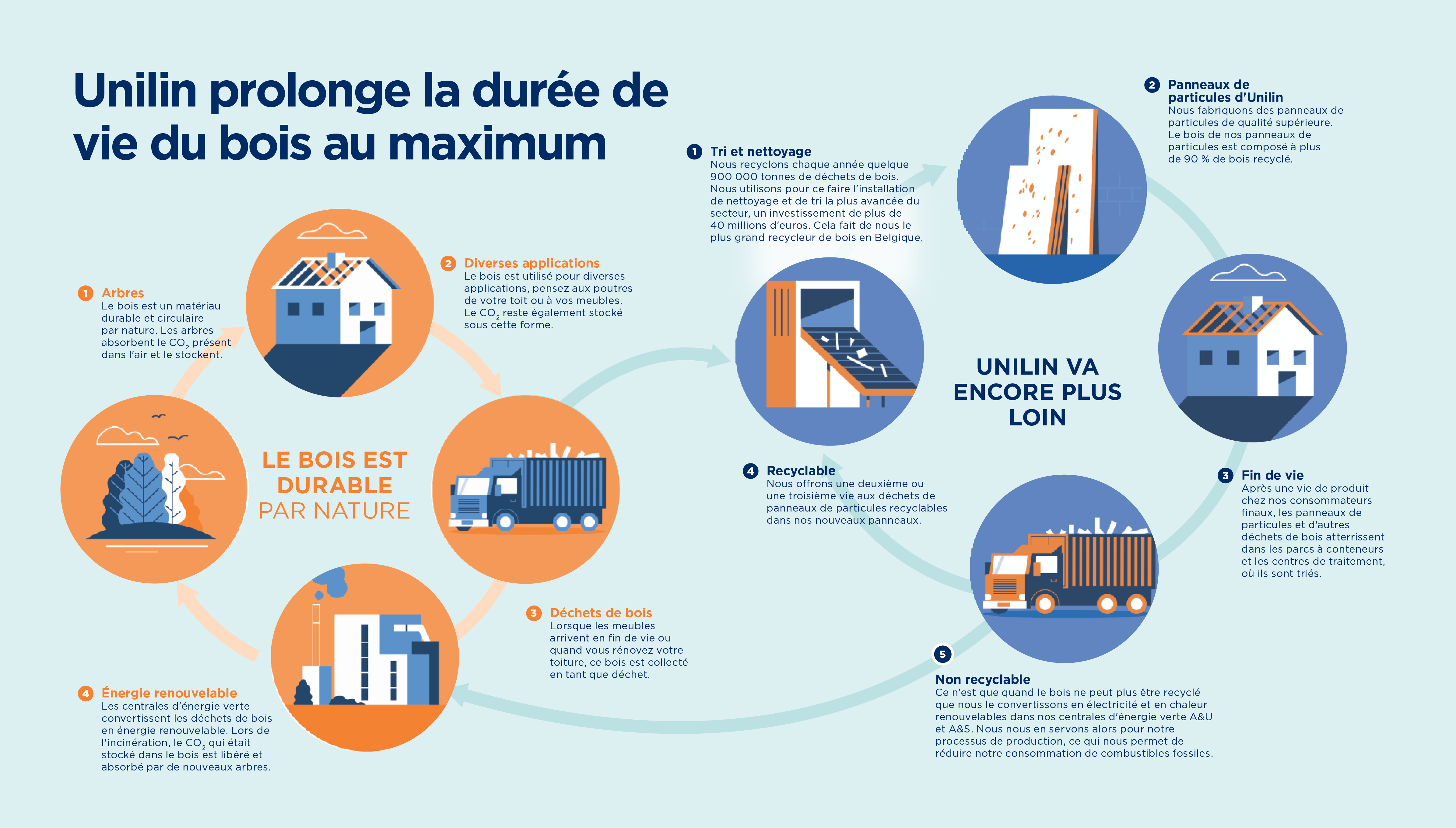 Chez Unilin, nous pensons qu’une approche circulaire est le seul moyen pour une entreprise industrielle d’être réellement parée pour l’avenir. La circularité ne s’inscrit pas seulement dans notre stratégie de durabilité One Home, elle fait partie de notre ADN. Depuis notre création en 1960, nous transformons des flux de déchets provenant d’autres industries en nouveaux produits. À l’époque, nous fabriquions des panneaux de particules avec des anas de lin, un flux de déchets issus de l’industrie du lin. Dans les années 80, nous sommes passés à des flux de déchets issus de l’industrie du bois. Aujourd’hui, nous poursuivons sur cette lancée avec une ambition claire : rendre nos produits entièrement circulaires, étape par étape, sans compromis sur le design, la qualité et le coût.