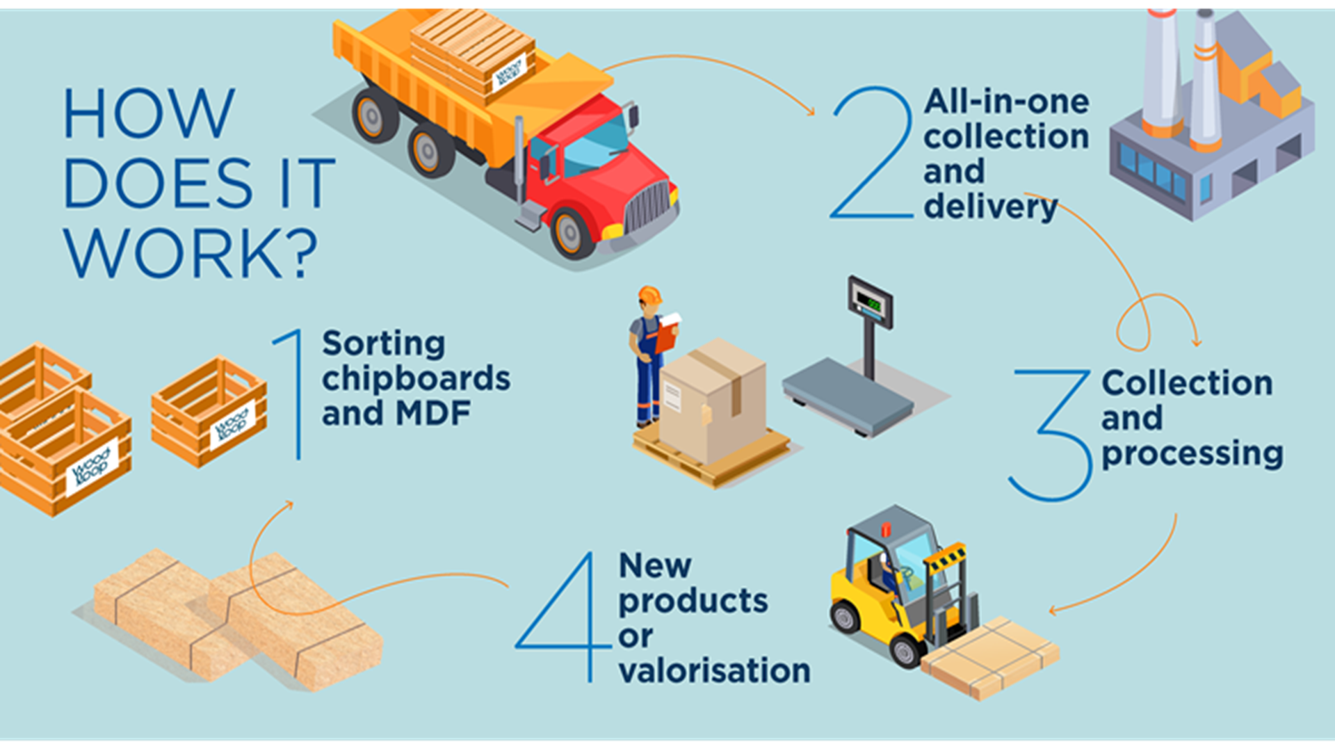 Toutes les chutes de bois des entreprises d’ameublement et de décoration d’intérieur étaient autrefois collectées en vrac par des spécialistes de la gestion des déchets, qui en assuraient le tri. Les entreprises et décorateurs d’intérieur placent désormais eux-mêmes leurs chutes de panneau d’aggloméré dans des caisses Wood Loop distinctes. Une caisse peut accueillir environ 360 kg d’aggloméré. Grâce au tri des déchets à la source, Wood Loop récupère une plus grande proportion de chutes de bois pour leur donner une seconde vie.Collecte et livraison en un